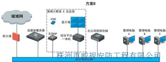 方案B,可通過對訪問人員的授權(quán),實現(xiàn)對分布在全國各地營業(yè)店的不同訪問權(quán)限;同時可在總部內(nèi)部搭建一套營銷示教系統(tǒng),總部銷售總監(jiān)、銷售培訓(xùn)主管可以利用該平臺,對各區(qū)域督導(dǎo)進行實戰(zhàn)培訓(xùn),系統(tǒng)可通過iPAD直接控制顯示墻,方便授課人員靈活操控。系統(tǒng)架構(gòu)圖如下: